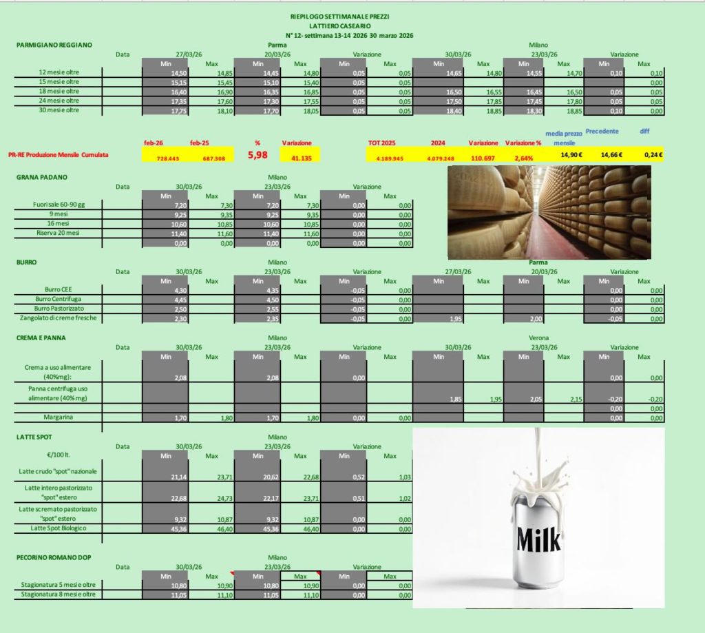 PARMIGIANO REGGIANO – Parma 30/3/2026 – A Parma i listini continuano a crescere (+5cent), e anche alla borsa milanese i prezzi crescono intensamente