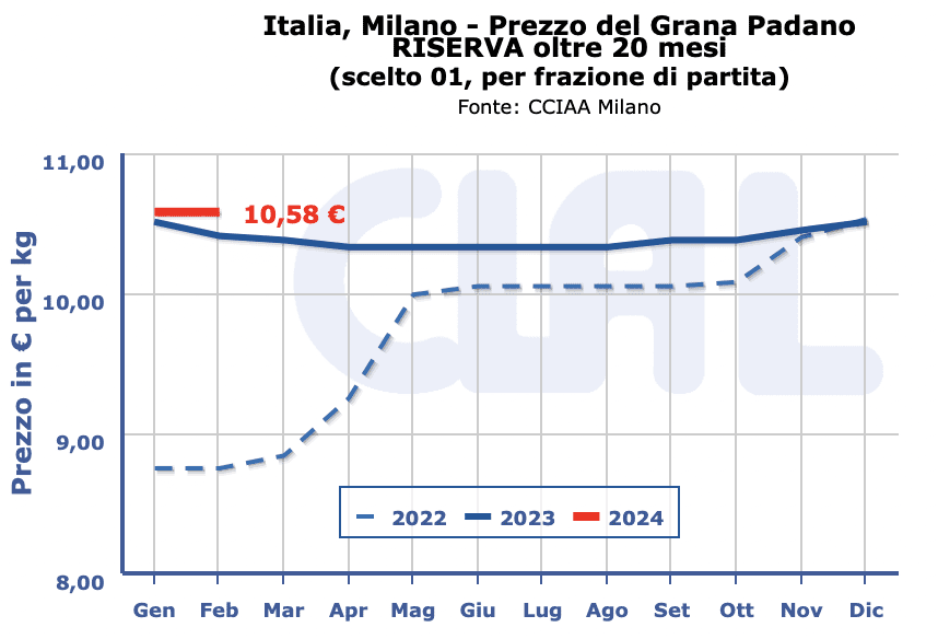 – Grana Padano Riserva 20 mesi di stagionatura e oltre: 10,55 – 10,70 €/Kg. (+)