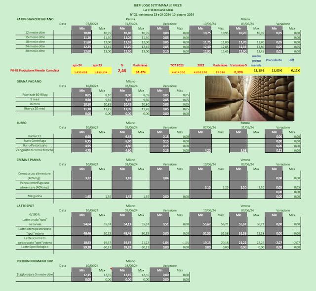 PARMIGIANO REGGIANO – Parma 07/6/2024 – A Parma, i listini guadagnano altri 5 cent. A Milano pure.