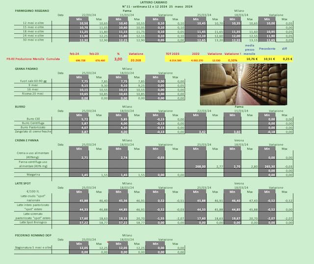 PARMIGIANO REGGIANO – Parma 22/3/2024 – A Parma, i listini sono ancora in progressione rialzista. Anche a Milano i prezzi sono in ripresa.