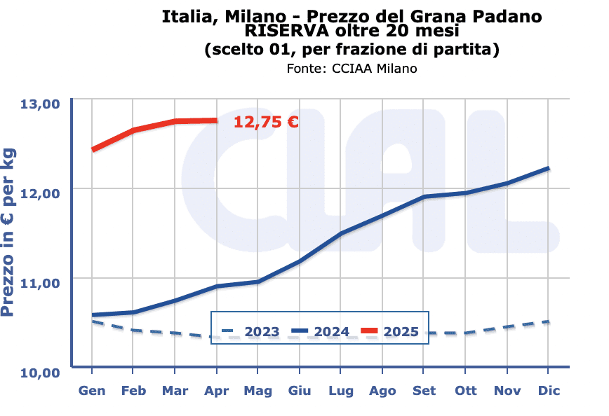 – Grana Padano Riserva 20 mesi di stagionatura e oltre: 12,65 – 12,85 €/Kg. (=)