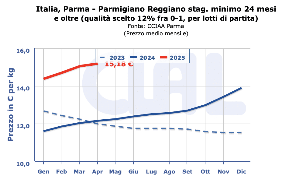 -Parmigiano Reggiano 24 mesi di stagionatura e oltre: 15,05 – 15,30 €/Kg. (=) – 15,35 – 15,75 €/kg (=)