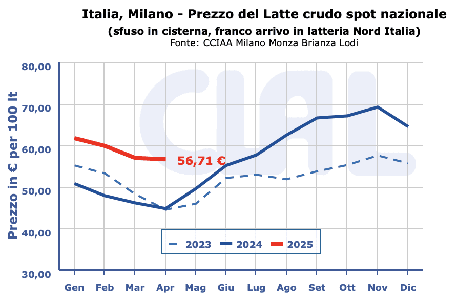 Latte crudo spot nazionale 56,19 57,22 (=) 55,67 57,22 (-)