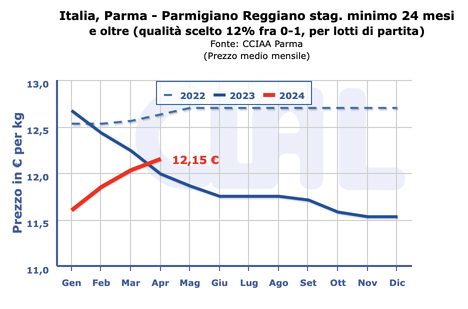 -Parmigiano Reggiano 24 mesi di stagionatura e oltre: 12,00 – 12,30 €/Kg. (=) – 12,20 – 12,70 €/kg (=)