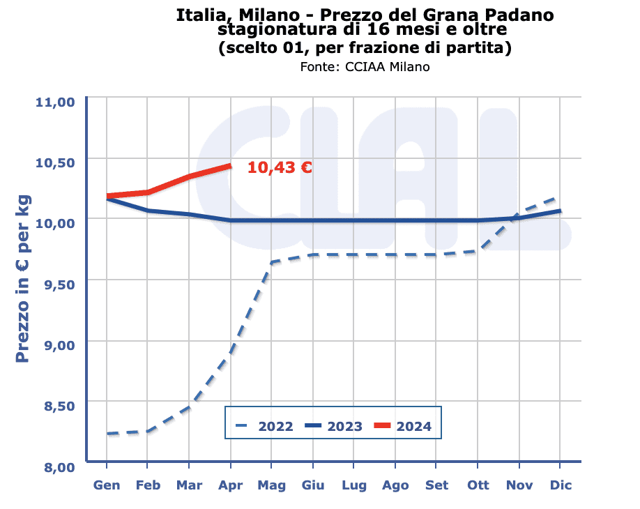 – Grana Padano 16 mesi di stagionatura e oltre: 10,35– 10,70 €/Kg. (=)