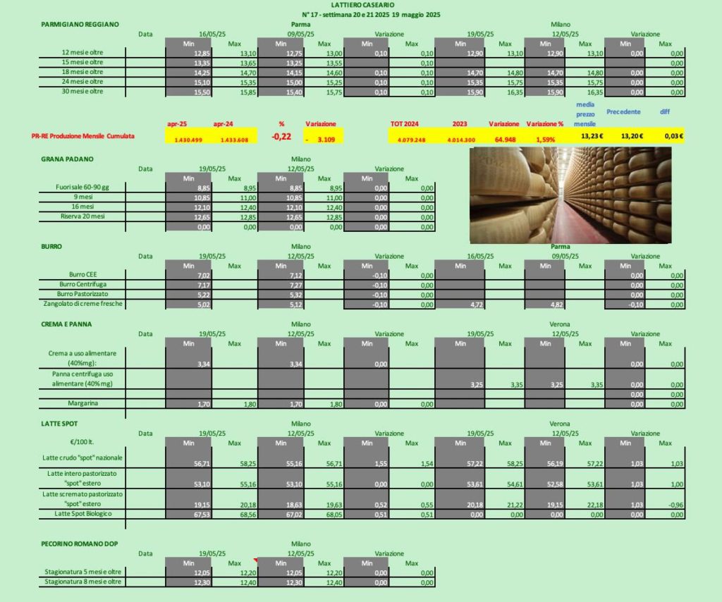 GRANA PADANO– Milano (19/5/2025) – Il Grana Padano: stabile.