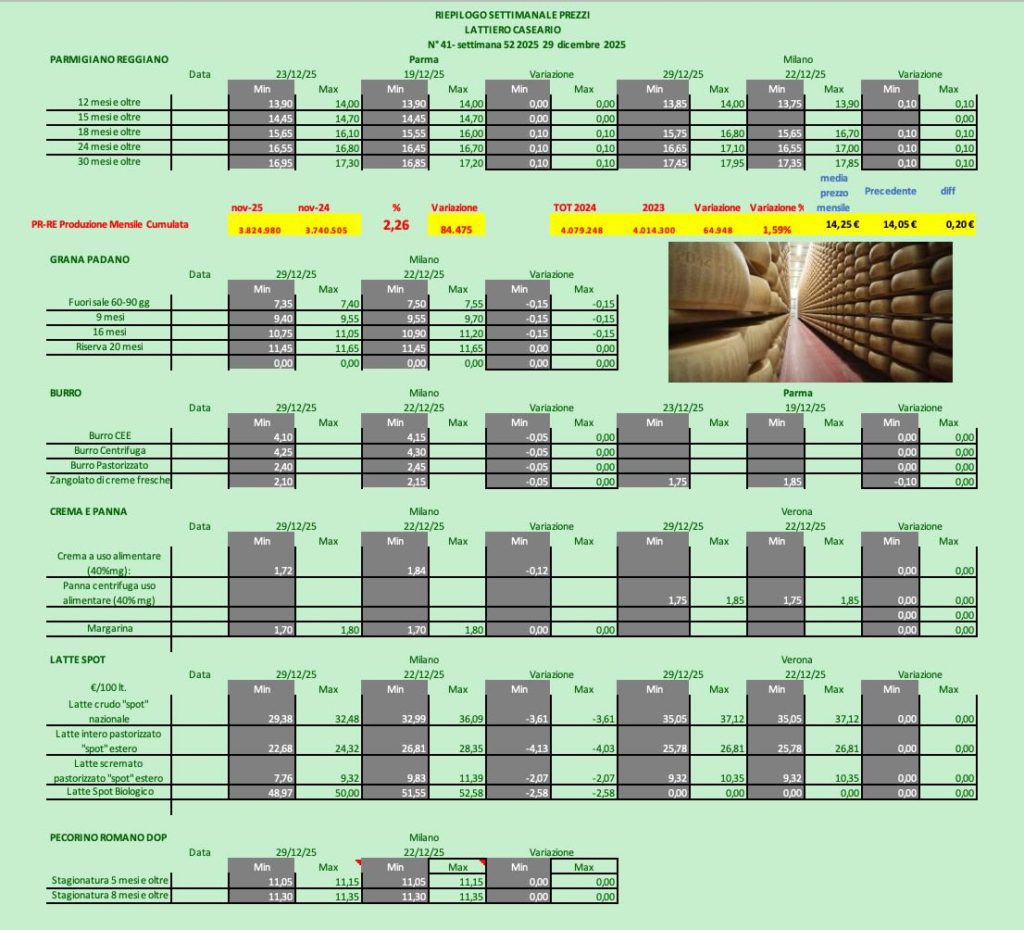 PARMIGIANO REGGIANO – Parma 23/12/2025 – A Parma i listini crescono le stagionature da 18 a 30 mesi mentre alla borsa milanese ci sono segnali di ripresa (+10 cent).