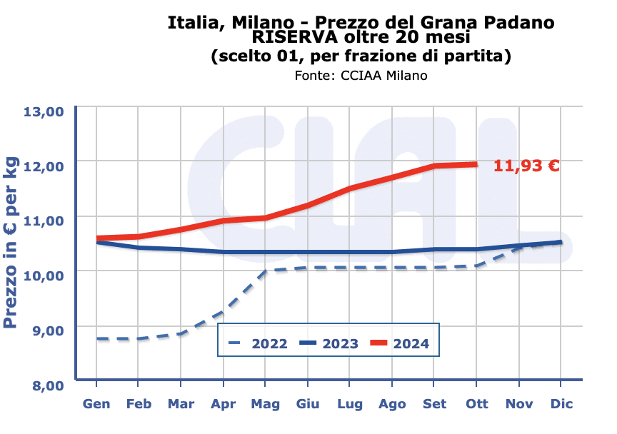 – Grana Padano Riserva 20 mesi di stagionatura e oltre: 11,90 – 12,05 €/Kg. (+)