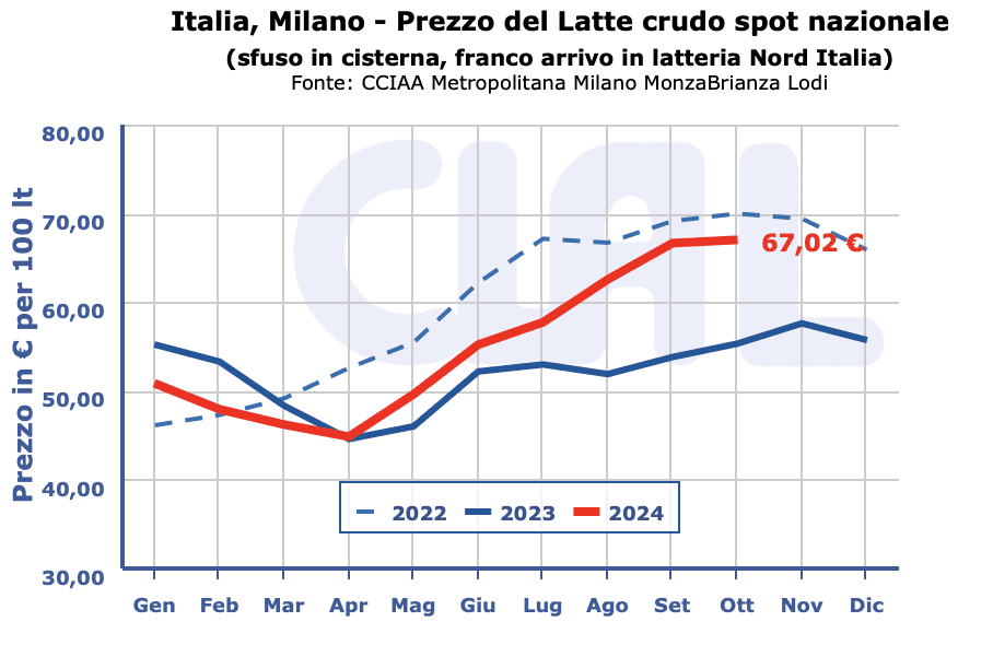 Latte crudo spot nazionale 68,05 69,98 (=) 66,50 68,05 (=)