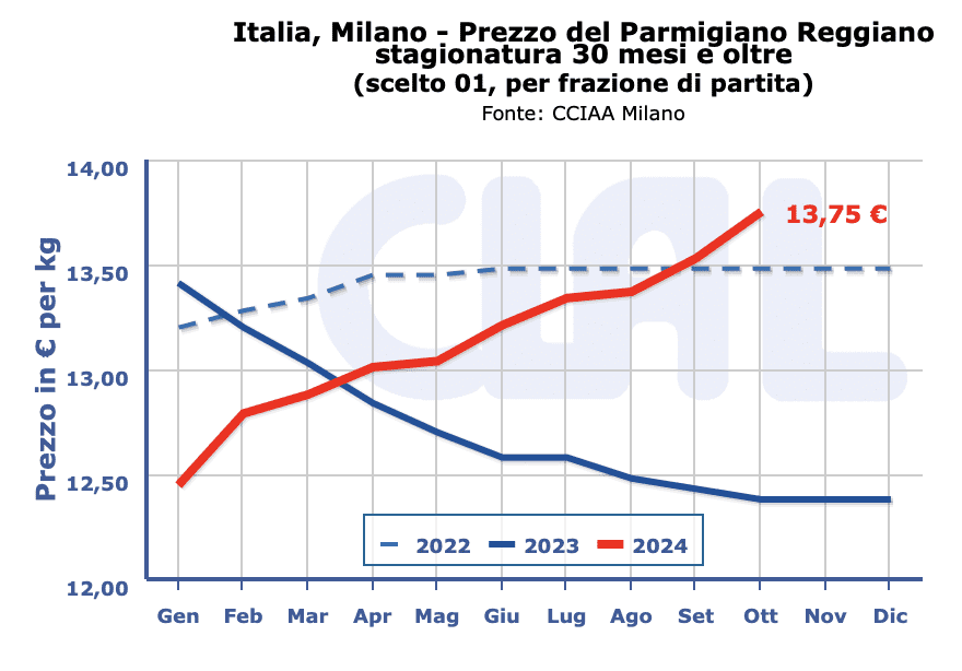-Parmigiano Reggiano 30 mesi di stagionatura e oltre: 13,25 – 13,55 €/Kg. (+) -13,70 – 14,20 €/kg (+)