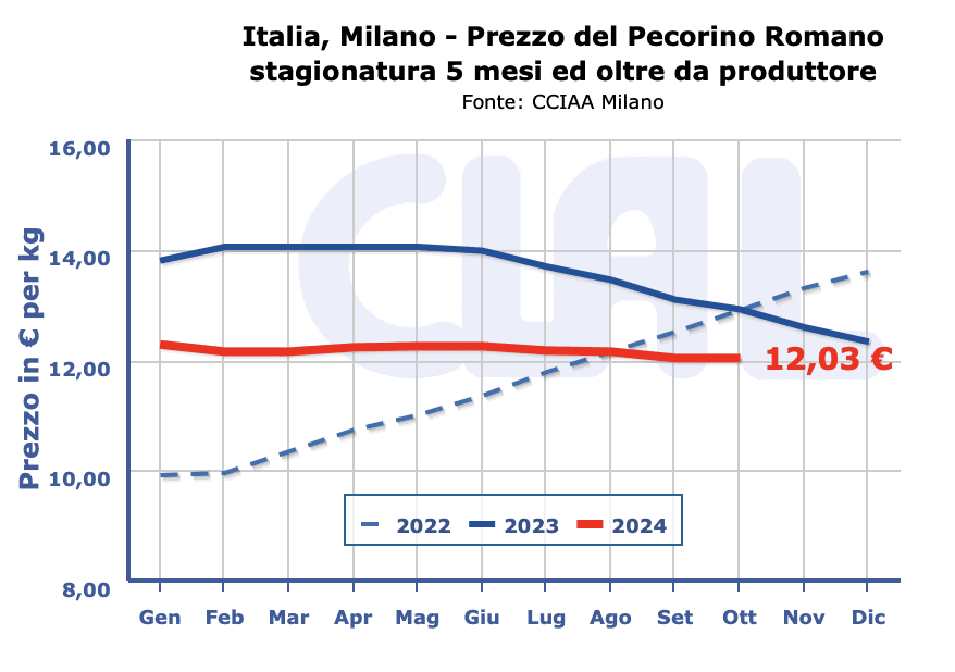 MILANO (21/10/2024) -Pecorino Romano DOP 5 mesi di stagionatura e oltre: 11,95– 12,10 €/Kg. (=)