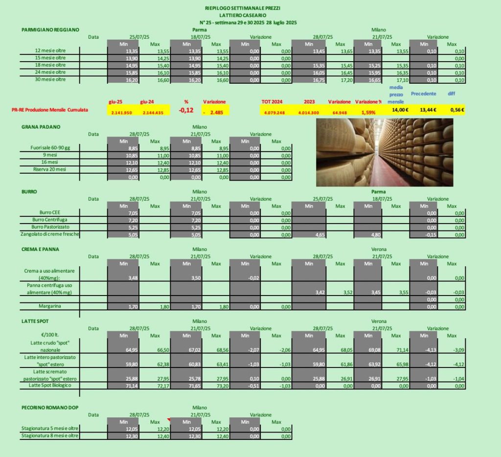 PARMIGIANO REGGIANO – Parma 25/7/2025 – A Parma i listini rallentano alla borsa milanese invece crescono.