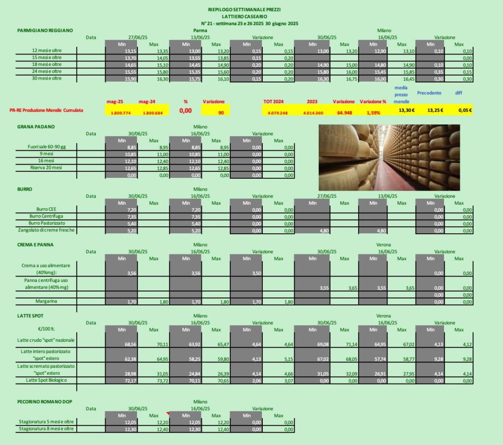 Le principali quotazioni rilevate nel periodo della XXV e XXVI settimana 2025 “Crema e latte in ripresa, Padano stabile e Parmigiano in salita “ (In allegato la Newsletter di Confcooperative Parma).