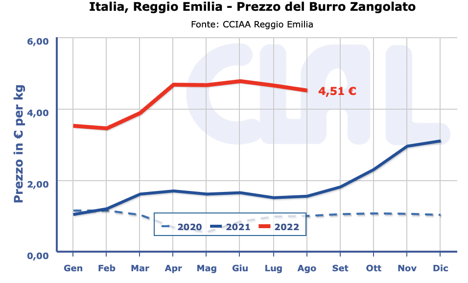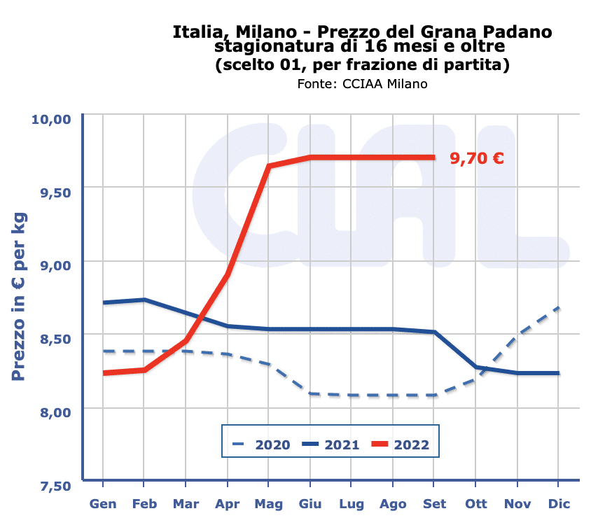 GRANA PADANO– Milano 19 settembre 2022– Stabilità per il Grana Padano ma con segnali di ripresa per il 9 mesi di stagionatura.