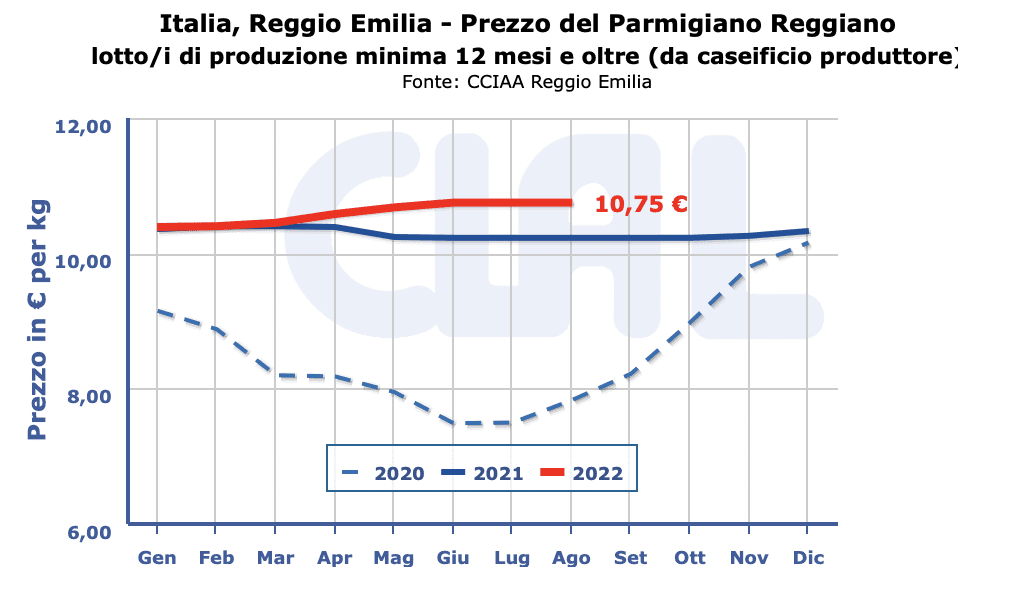-Parmigiano Reggiano 12 mesi di stagionatura e oltre: 10,65 – 10,80 €/Kg. (=) – 10,45 – 10,75 €/kg (=)