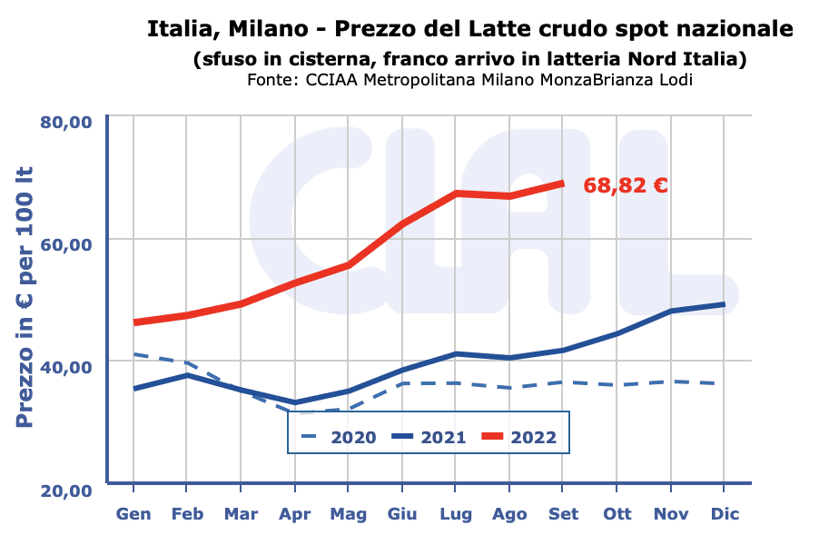 Latte crudo spot Nazionale 69,08 70,11 (=) 68,56 69.59 (=)