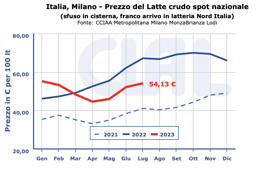 Latte crudo spot Nazionale 54,64 55,67 (=) 53,10 55,16 (=)
