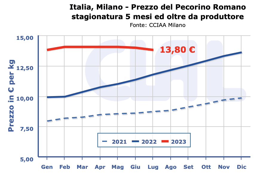 PECORINO ROMANO DOP – Milano 3 luglio 2023 – A Milano il prezzo segna una prima flessione (-15 cent).