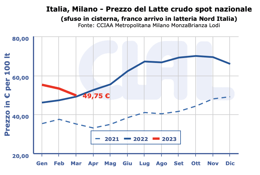 Latte crudo spot Nazionale 45,36 46,91 (-) 43,82 45,36 (-)
