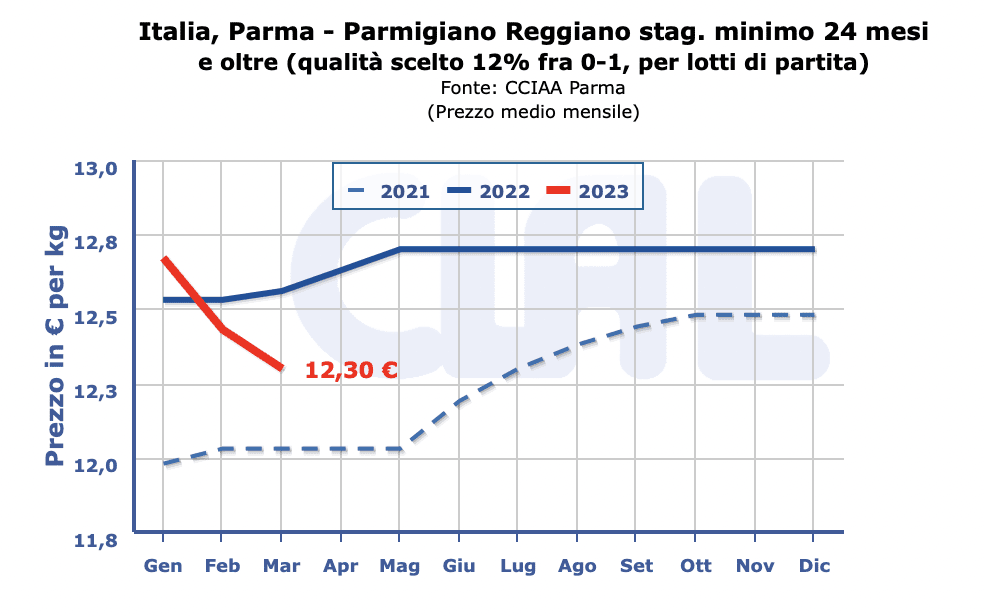 -Parmigiano Reggiano 30 mesi di stagionatura e oltre: 12,50 –13,30 €/Kg. (=) – 12,60 – 13,15 €/kg (=)