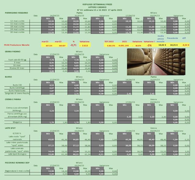 PARMIGIANO REGGIANO – Parma 14 aprile 2023 – A Parma i prezzi iniziano la discesa dalle stagionature più commerciali. A Milano i prezzi cedono in modo consistente.
