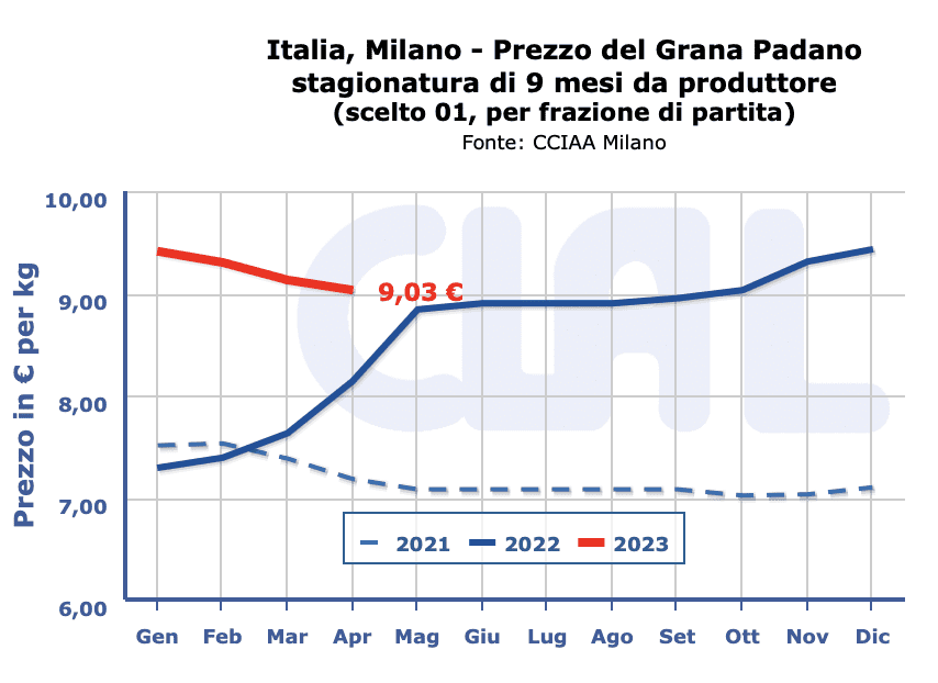 – Grana Padano 9 mesi di stagionatura e oltre: 8,95 – 9,10 €/Kg. (-)