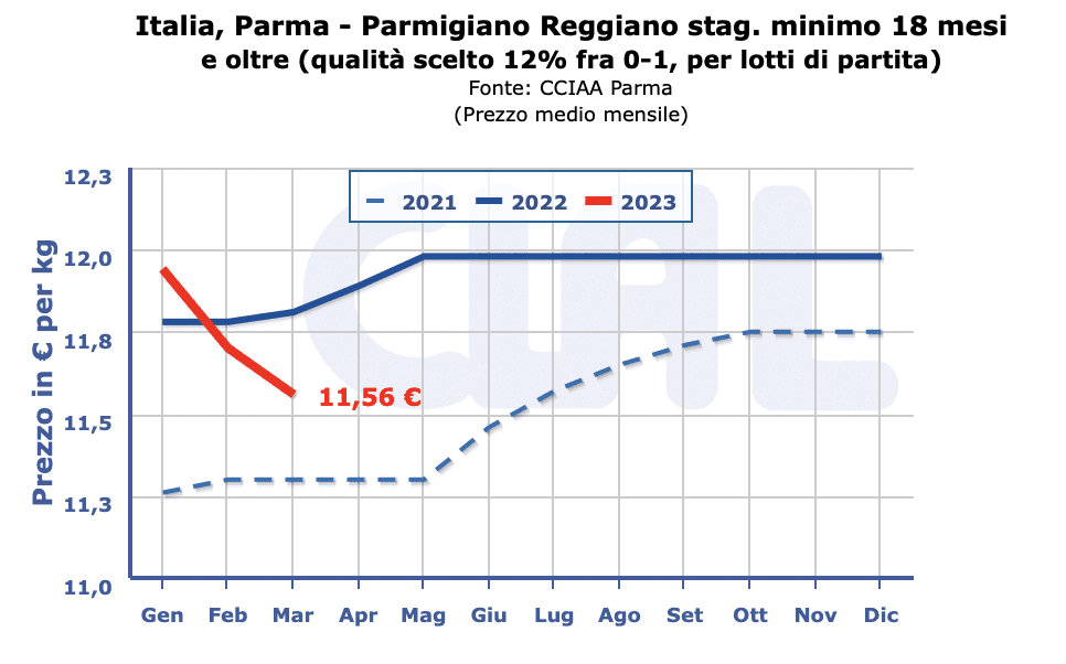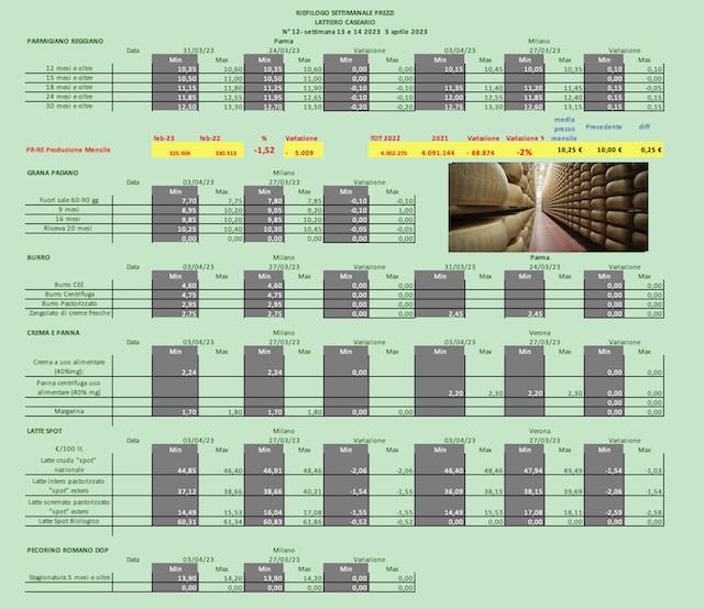 PARMIGIANO REGGIANO – Parma 24 marzo 2023 – A Parma i prezzi iniziano la discesa dalle stagionature più commerciali. A Milano i prezzi cedono in modo consistente.