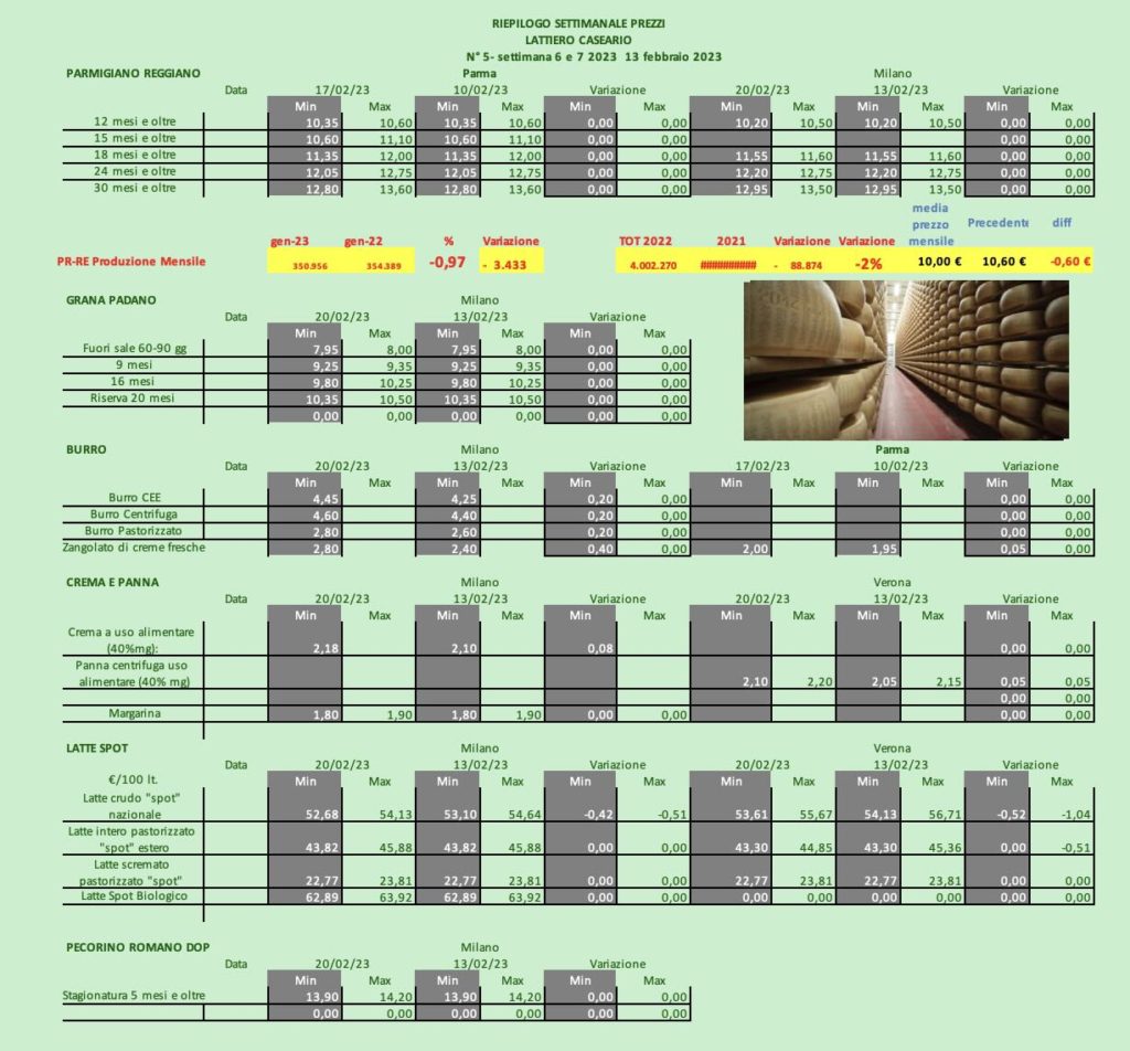 PARMIGIANO REGGIANO – Parma 17 febbraio 2023 – A Parma i prezzi si confermano. Milano il prezzo è stazionario