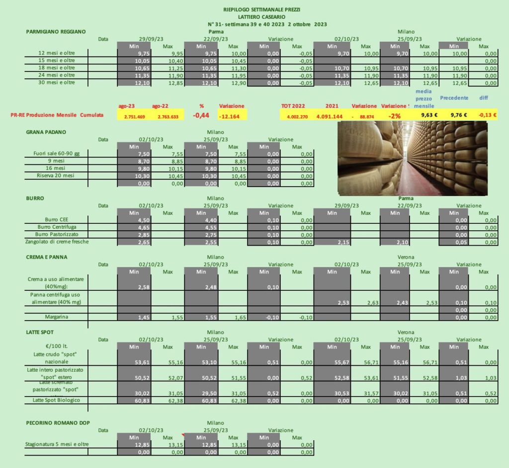 PARMIGIANO REGGIANO – Parma 29 settembre 2023 – A Parma , i prezzi cedono 5 centesimi. Milano invece i prezzi mantengono la stabilità.