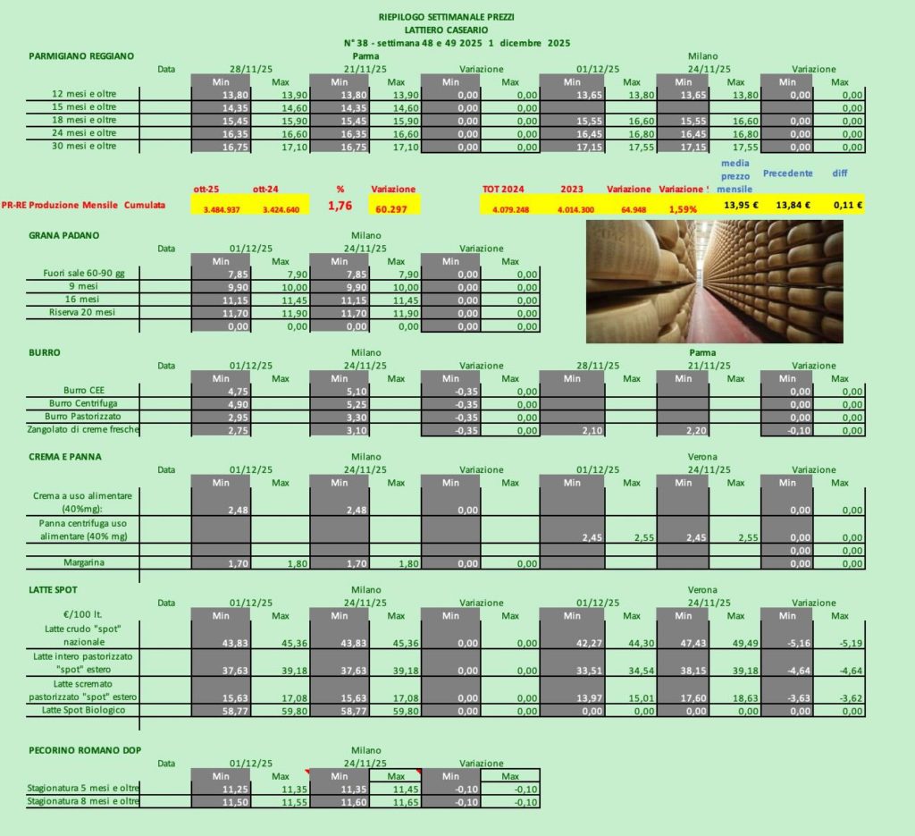 GRANA PADANO– Milano (1/12/2025) – Grana Padano: Torna stabile