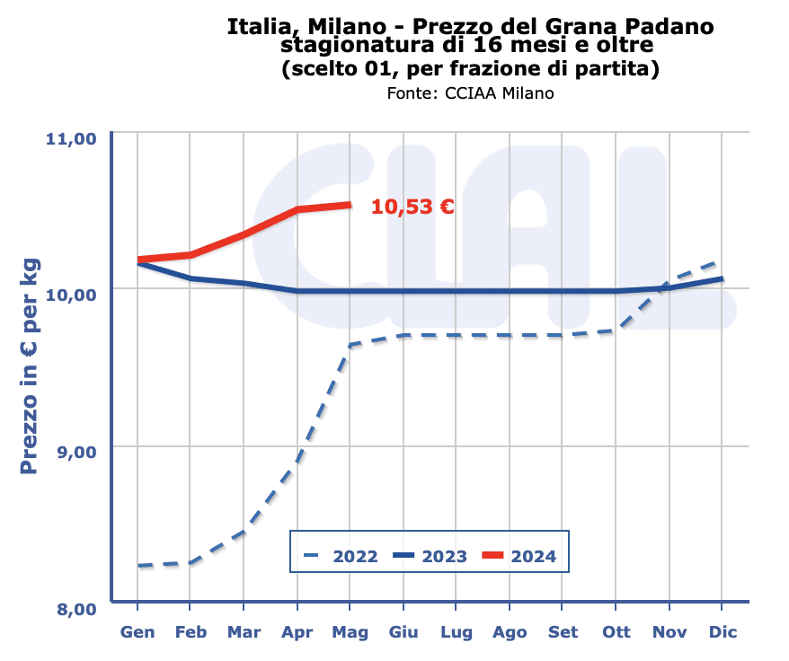 – Grana Padano 16 mesi di stagionatura e oltre: 10,35– 10,70 €/Kg. (=)