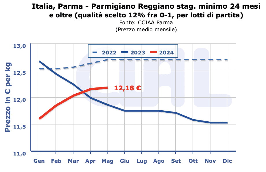 -Parmigiano Reggiano 24 mesi di stagionatura e oltre: 12,05 – 12,30 €/Kg. (+) – 12,20 – 12,70 €/kg (=)