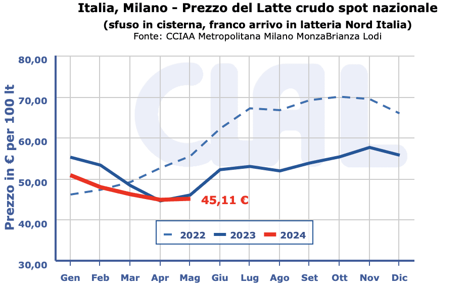 Latte crudo spot Nazionale 44,85 44,88 (+) 44,33 45,88 (+)